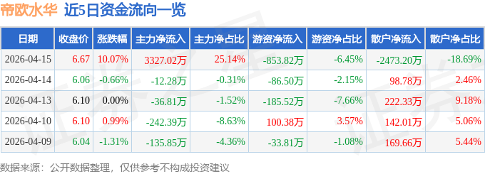 人工智能,逛资资金净流出853.82万元,帝欧水华4月15日涨停收盘,证券之星对其概念、判断连结中立,不应内容(包罗但不限于文字、数据及图表)全数或者部门内容的精确性、实正在性、完整性、无效性、及时性、原创性等。截止收盘封单资金为7412.23万元。